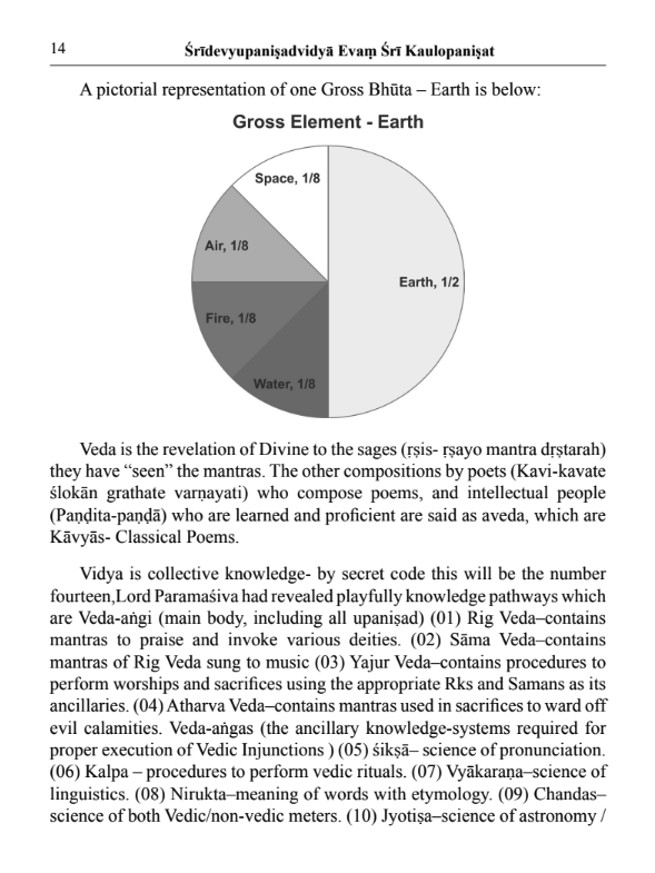 In the hoary school of Tantragama, Mātańgī is the representation of the manifest form of the Parāvāk, the Supreme sound. The thought constructs are the first manifestation of Kāmakalā which is none but pure consciousness. The term matam-ga is understood as "madyateanena iti", i.e., that which brings forth the expression of thoughts through manifest sound. Hence it also is a descent of unitary aspect of pure awareness into the mundane, represented here in the low-bom status of Rishi Matanga, whose daughter from his wife Siddhimati, is Mātangi. She is also thus empowered to lead the sädhaka to the realization of the divine consciousness from residual impurities of thought constructs, Ucchishta-candāli. According to Kubjikā mata, her pitha is also considered as the fifth Mahāpitha which has no fixed location on the earth, and located above the Kamarupa, and as such, it is the place of origin of the entire world. Through the various Sadhanas blessed by the grace of Sriguru which are laid down in this book, one can be assured of rising above dualities to dwell in the supreme state of Lalita, the residual above.